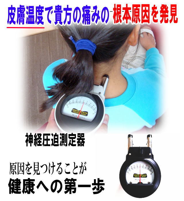 首痛・腰痛・肩こり の根本原因(関節がズレると、神経を圧迫する事が痛みや痺れを引き起こす)がある場所は、正常な場所とは温度差があります。皮膚温度差で首の痛みの原因を見つけます。皮膚にスーとなぞるだけです。